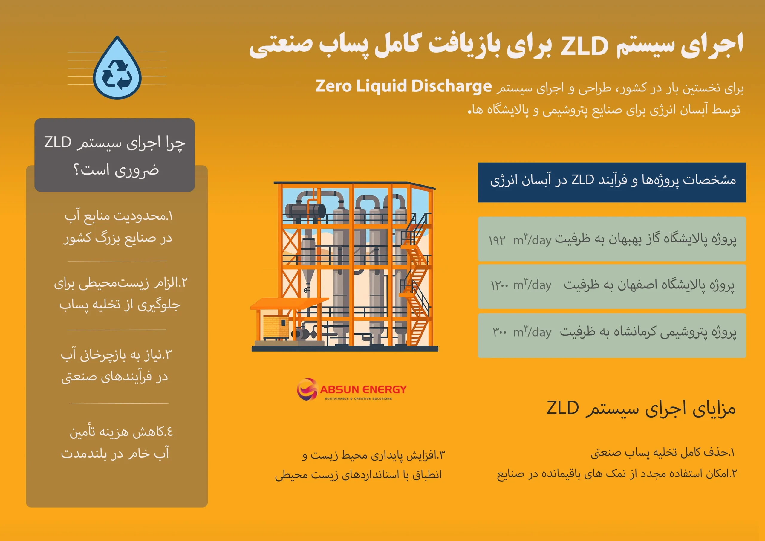 امروزه با عنایت به تغییرات اقلیمی گسترده در سطح جهان و مضافا تنش آبی و بروز خشکسالی در کشور عزیزمان ایران که برگرفته از موقعیت جغرافیایی آن می باشد، حفظ آب به عنوان یک عنصر کلیدی و غیر قابل انکار در جهت ادامه حیات قلمداد شده و یکی از فاکتور های مهم در توسعه پایدار کشورمان محسوب می گردد که بدین منظور لزوم بازگرداندن این مایع حیاتی و خدادادی به چرخه تولید در صنعت از طریق تصفیه آب و پساب بالطبع موجب کاهش وقطع وابستگی صنایع به سایر منابع آبی موجود گردیده و از اهمیت بسیار بالایی برخوردار است. اینک شرکت آبسان انرژی ضمن برخورداری از دانش روز دنیا و نزدیک به دو دهه تجارب گرانقدر در زمینه تصفیه آب و پساب های صنعتی و با اتکا به نیروهای مجرب، متخصص و متعهد خود در این خصوص مفتخر است که سهمی هر چند کوچک در راه رشد و اعتلای صنعت این مرز و بوم برداشته باشد..