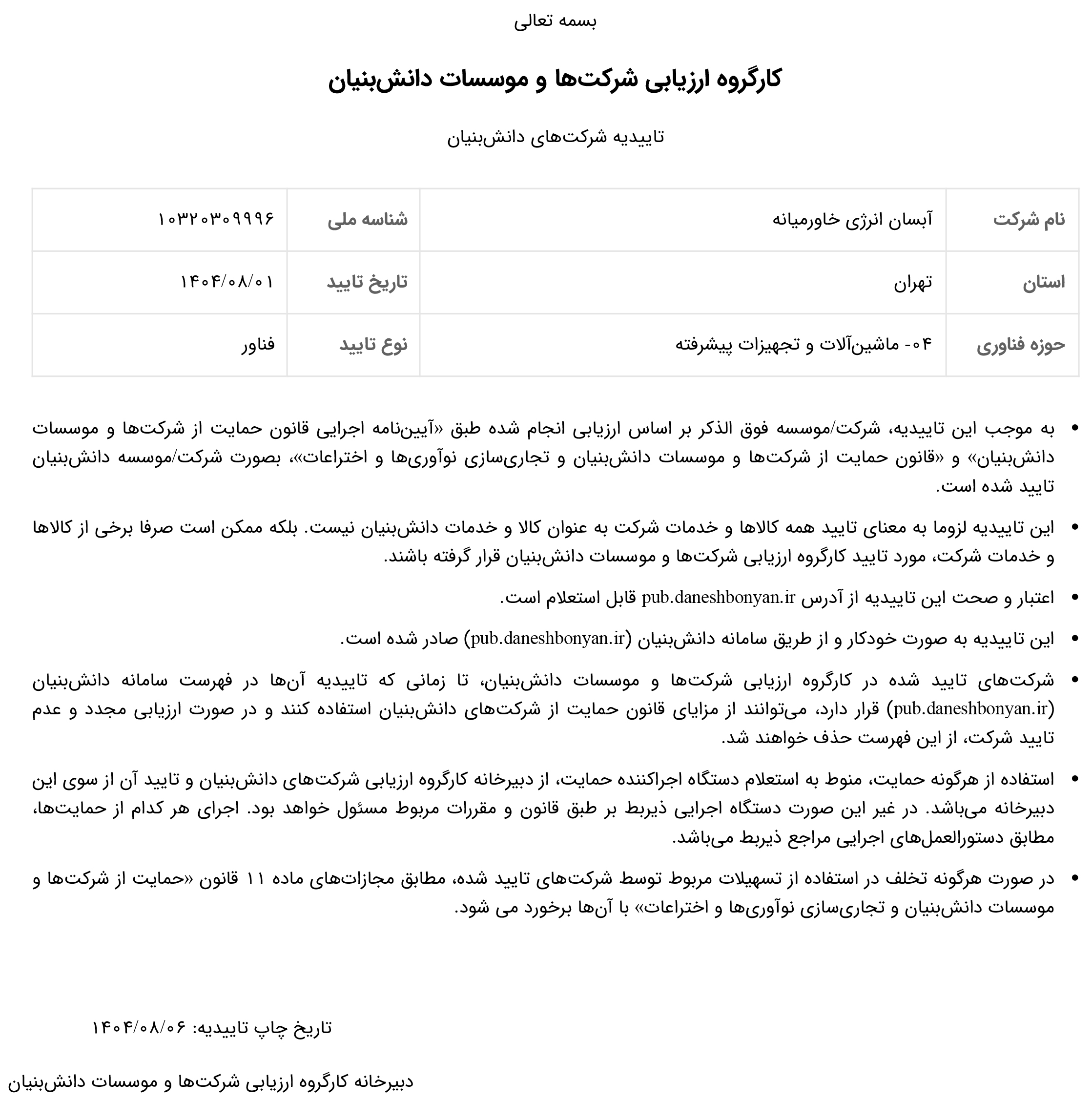 با افتخار اعلام میکنیم که شرکت آبسان انرژی با تکیه بر دانش فنی، نوآوری و تجربیات صنعتی خود، موفق به اخذ تأییدیه شرکت دانشبنیان گردیده است.
